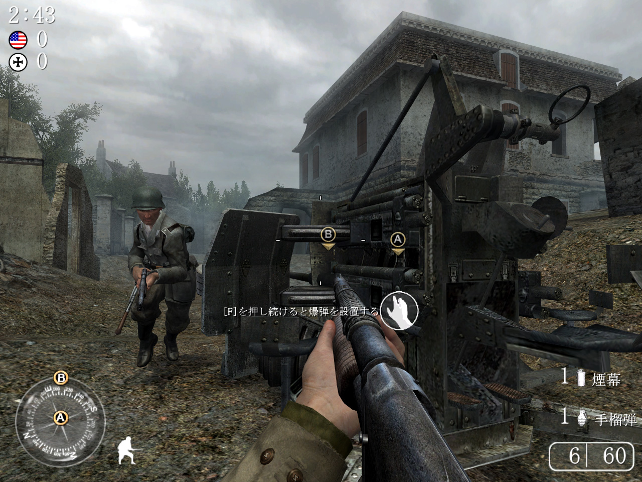 今回とくに手強いのは,グレネードだ。遮蔽物の背後にいると,必ずといっていいほど投擲してくるのだが,こちらはMG42で射すくめられて逃げ場もない,なんて場合も多く,爆死頻発。まさに戦場の必殺パターンだが,まさか敵AIが完璧に使いこなしてくるとは,とほほ。