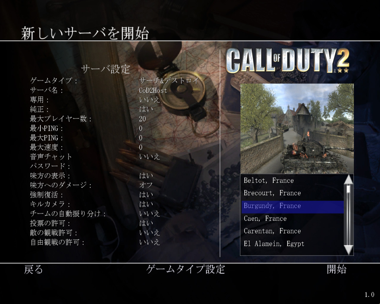 | こちらがマルチプレイの画面。サーバー設定,武器選択,そしてヘルプ画面などがちゃんと日本語。これからの我が国におけるCoD2サーバーの盛り上がりに,とても期待したい。そして,ぜひ仲間に入れてほしい | ||
