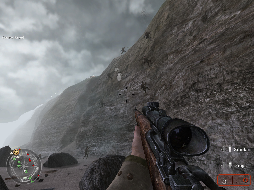 砂漠の戦いもいいが,私が最も好きなのが,冒頭に紹介したアメリカ陸軍第2レンジャー大隊のビル・テイラー伍長のパートだ。上陸用舟艇の中の緊張した雰囲気から,銃弾の飛び交う海岸に一気に突入。燃え上がる舟艇からよろめき出る,火だるまの兵士。撃ち倒される衛生兵。アリのように崖を這い上がっていくレンジャーの中には,足を滑らせてまっ逆さまに落下する兵士もいる。抜群の演出で「戦争映画の登場人物になったような気分」にさせてくれるのがCoDシリーズの真骨頂なら,まさにこのシーンにそのエッセンスが凝縮されているように思う。「こんなことが本当にあったんだなぁ……」と思うと,得も言われぬ感覚に襲われる。