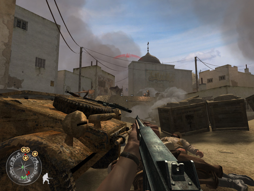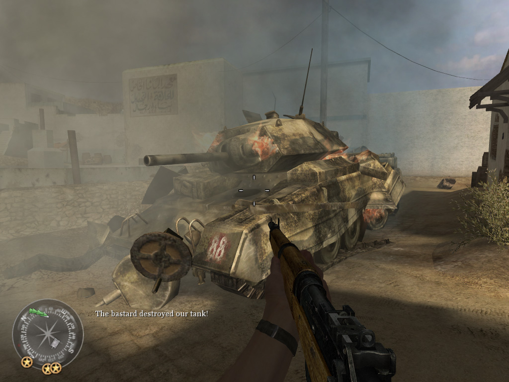 「クルセーダー」快速戦車による砂漠の機動会戦は,間違いなくCoD2の白眉の一つだ。前作にも戦車戦闘は登場したものの,今回はスピード感といい,マップの広さといい,迫力満点の機甲戦が堪能できる。筆者のような「キャタピラ熱愛派」には堪えられないものがあり,このパートの人気が高いのも納得だ。ただ,惜しむらくは,相対するドイツ軍の戦車がどっからどう見ても「2号戦車」で,20ミリ機関砲搭載のはずなのに,大砲で攻撃してくるところかな。後半のノルマンディ戦以降には,ちゃんとツィメリットコーティングを施したタイガーI型が出てくるので,よく分かんないけど安心してほしい。
