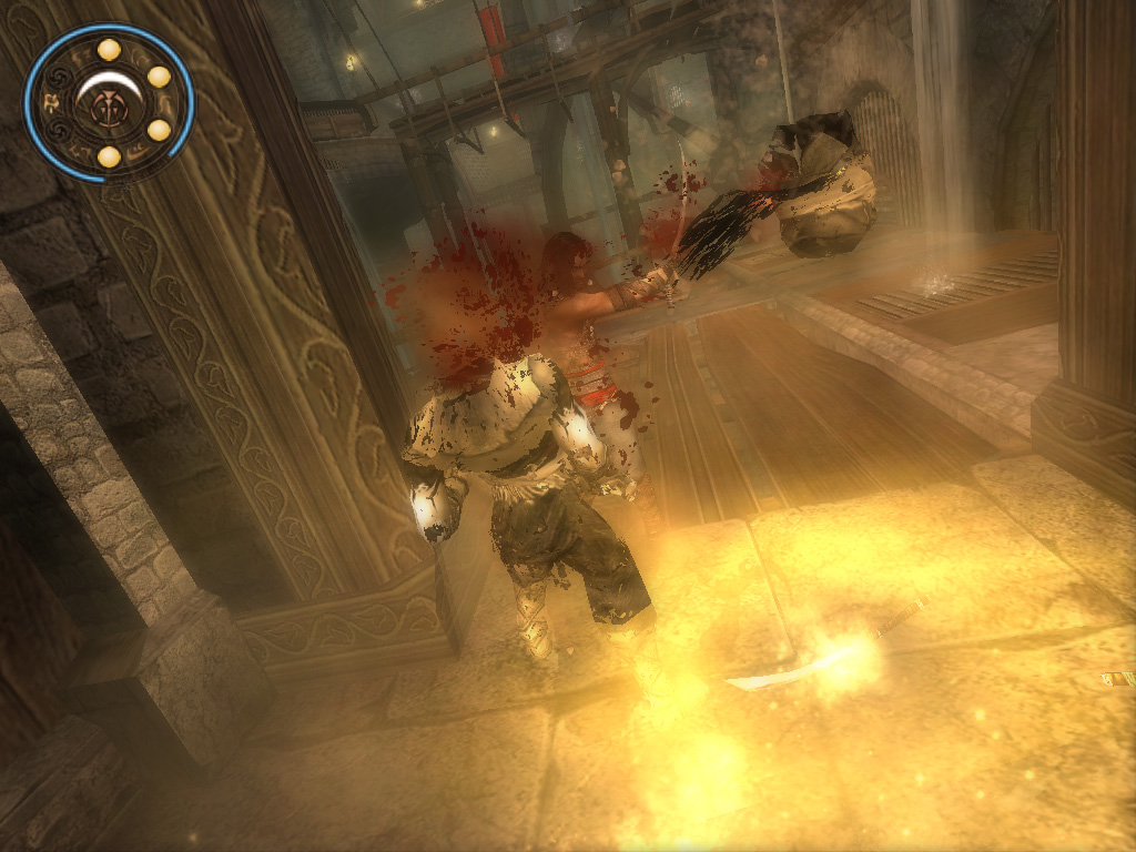| 刃のついた回転柱に丸ノコギリ。PoPの代名詞とも言えるデッドリーなトラップは今作にも登場する | 倒した敵の身体から,ときどき光の玉が現れる。これが時間に関する能力を使うために必要な"時の砂"だ | 時間の流れを遅くする能力を使用すると,画面に特殊効果が。ゆっくりとしか動けない敵を存分に攻撃しよう |