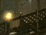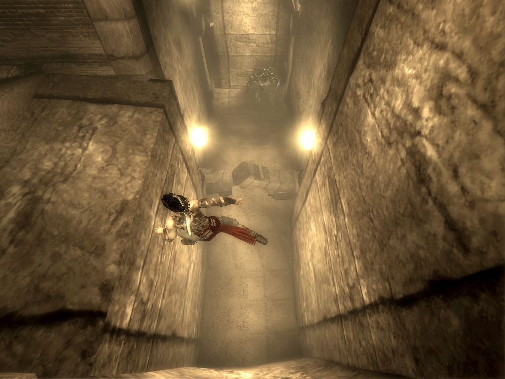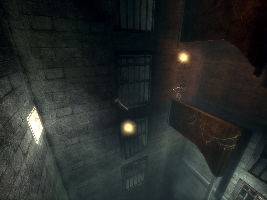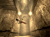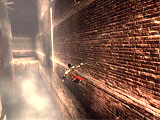 | マップ攻略に欠かせない動作の一つ"ウォールラン"。先に進めなくなったら,まずこの動作のことを思い出そう | 着地に失敗すれば奈落の底に真っ逆さまというシチュエーション。高所がニガテな人は見ていてかなり恐いはず | 細い足場をよたよたと歩く王子。プレイしていてジャンプの瞬間に目を覆いたくなってしまうこともしばしば |