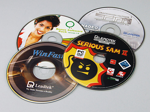 | 付属品一覧。本文で触れたS/コンポーネントビデオは専用ケーブルでの対応となる。なお,ゲームは「Serious Sam II」と「TrackMania Nation ESWC」の英語フルバージョン2本が用意されている |