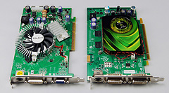 | GeForce 7600 GTカード同士の比較。左がWinFast A7600GT,右がPCI Express x16版リファレンスカードだ。カード長はほぼ同じ |