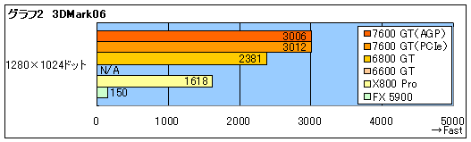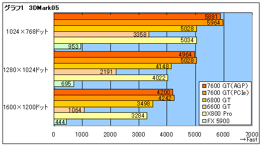 テスト結果をまとめたのがグラフ1,2だが,AGP 8XとPCI Express x16で,GeForce 7600 GTの2枚にパフォーマンス差はほとんどない。HSIによる信号変換のオーバーヘッドで,AGP版のスコアがわずかに低いが,まあ,気にするほどではないだろう。