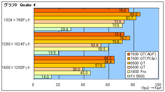 「Quake 4」(Version 1.2)における結果をまとめたのがグラフ3だが,AGPグラフィックスカード同士を比較してみると,1280×1024ドット以上で,GeForce 6600 GTやRadeon X800 Proに大きな差を付けるのと,GeForce FX 5900とは比較にならないことが見て取れる。