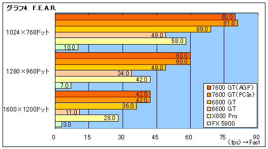 というわけで,次に「F.E.A.R.」(Version 1.05)である(グラフ4)。F.E.A.R.では,CPUとグラフィックスカードの性能がスコアに直結しやすく,傾向としてチップセット(≒マザーボード)の影響は少ないが,それを裏付けるように,同じCPUを用いているAGP版とPCI Express版のGeForce 7600 GTで,スコアの差はほとんどない。1024×768ドットではFPSをプレイするのにほぼ十分なフレームレートだ。1280×960ドットだと及第点レベルに留まるが,これはミドルレンジ向けGPUということを考えると,やむを得ないだろう。