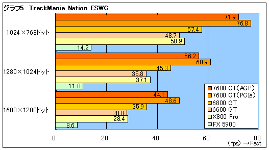 続いて「TrackMania Nation ESWC」。同タイトルは描画負荷が軽いため,解像度が高くなってもCPUがボトルネックになりにくいが,こうなると顕著になってくるのがHSIのボトルネックだ(グラフ5)。GeForce 7600 GTの2モデルでは,常にAGP版が数fps低く,HSIを挟むことのハンデが見て取れる。もっとも,動作クロックの高さもあって,既存の定番GPUを大きく引き離しており,PCI Express x16環境を考慮しないのであれば,問題のないスコアではある。