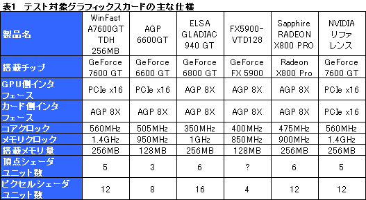 今回,比較用に用意したのは,AGP世代で人気を集めた製品だ。必ずしもウルトラハイエンドではなく,実際に入手しやすかったものを中心に選択している。具体的な製品名とスペックは表1にまとめたが,以下本文では,必要に迫られない限り,表の2段めにあるGPU名でカードを表記するので,この点は注意してほしい。