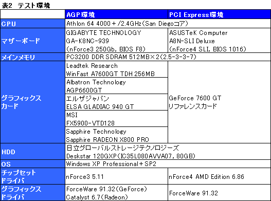 このほか,テスト環境は表2のとおり。AGP版GeForce 7600 GTを認識させるため,グラフィックスドライバはWinFast A7600GTのパッケージに付属していた「ForceWare 91.32」を利用している。