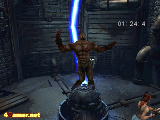 屋敷外に出るころになると,アリーンは闇のクリーチャー達に追いかけられることに。画像は,そのクリーチャーを倒すため,砦である装置を起動して稲妻で感電させたところ。このクリーチャーは跳びかかってくる習性があるので,それを利用するのだ。素早くかつタイミングよく誘導することが必要だ