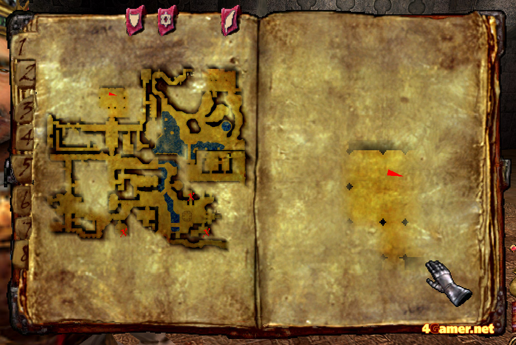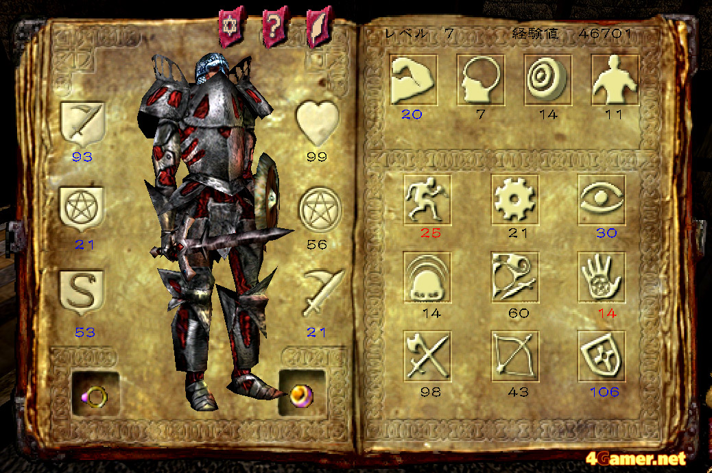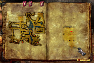 | F3キーでマップを呼び出せる。×印が付いているのは,会話などで出てきた重要地点。ただしこの画面の3か所は,単に"お店" | なんとも意外な人物から,最強の鎧を入手したところ。盾がショボイのは,ご愛敬(プレイした人なら,画面をよく見れば理由が分かるだろう) |