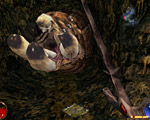 | 「誰か助けて〜」となき悲しむ女性に近寄ってみると,これ。助けがほしいのは,こっちだ | 洞窟の幅いっぱいの超巨大モンスターも登場。チラッと見えただけで,恐い | |