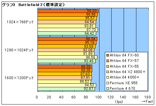 Battlefield 2は,ネットワーク,あるいはサウンド周りが一部マルチスレッド化されていると思われるが,それを裏付けるように,1024×768ドットと1280×1024ドットで,FX-60がFX-57を上回った。ドライバとアプリケーション側が対応していれば,デュアルコアCPUは1クロックグレード上のCPUを凌駕できる可能性が十分にあるといえそうだ。