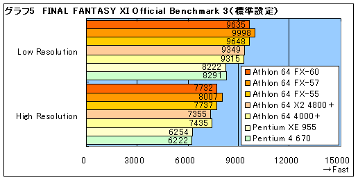 とはいえ,FINAL FANTASY XI Official Benchmark 3のように,デュアルコアCPUのメリットがまったくなく,純粋にシングルスレッド性能がスコアに直結するものもあることは覚えておいたほうがいいだろう(グラフ5)。こういったゲームだと,FX-60のパフォーマンスは同じ2.6GHzで動作するFX-55と変わらなくなる。