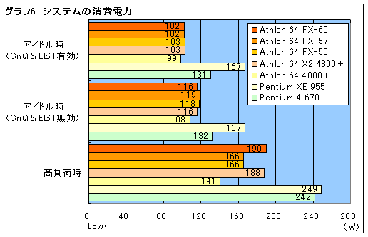 結果はグラフ6にまとめたとおり。アイドル時こそ,ほかのAthlon 64シリーズとあまり変わらないFX-60だが,高負荷時には190Wと,シングルコアCPUと比べて消費電力はかなり高くなる。Pentium XE 955やPentium 4 670よりは50W以上低いものの,それは比較対象が悪すぎるだけ。FX-57とは24W,4000+とは49Wものの開きがあるFX-60の消費電力は,かなり大きい印象を受けた。