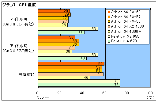 結果はグラフ7にまとめたが,結論からいうと,突出して高いわけではなかった。今回テストしているAthlon 64シリーズの中で最も発熱が多いのは確かだが,FX-57との差はわずかに2℃であり,消費電力ほどの開きはない。FX-60の冷却に当たって,特別な配慮が必要ということはなさそうだ。