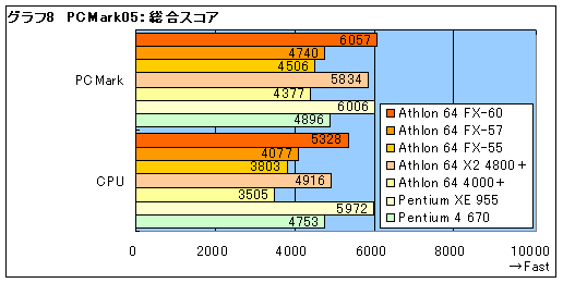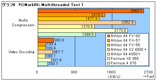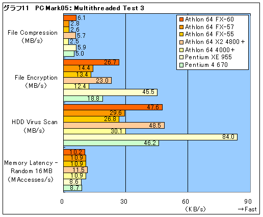 最後に,ゲーム以外の一般的なWindows操作におけるパフォーマンスを,PCMark05で計測してみた結果がグラフ8だ。マルチスレッド対応アプリケーションや,Windows上で同時に複数の作業を行う場合におけるデュアルコアCPUのメリットは「PCMark」のスコアから明らかである。具体的に,どういったテストでシングルコアCPUに対してメリットがあるかは,別途グラフ9〜11にまとめてみたので――ゲームとは直接関係ないから言及しないが――興味のある人は下のリンクからグラフを開いてみてほしい。
