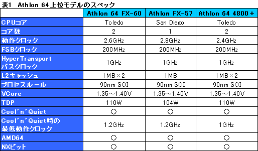 FX-60の正式名称は「Athlon 64 FX-60 デュアルコア・プロセッサ」で,その名のとおり,Athlon 64 FXブランドとしては初のデュアルコアCPUとなる。CPUコアはAthlon 64 X2 4800+/2.4GHz(以下4800+)と同じToledo(トレド)。スペックは表1にまとめたとおりだが,Athlon 64 FXシリーズでこれまで最上位に置かれていたAthlon 64 FX-57/2.8GHz(以下FX-57)ではなく,4800+の上位モデルといっていい内容になっている。