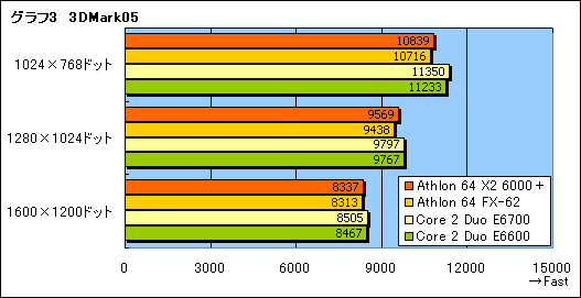 次に「3DMark05 Build 1.3.0」(以下3DMark05,グラフ3)。傾向そのものは3DMark06と同様だが,Athlon 64 X2 6000+のスコアが,Core 2 Duo E6600から若干置いて行かれている。