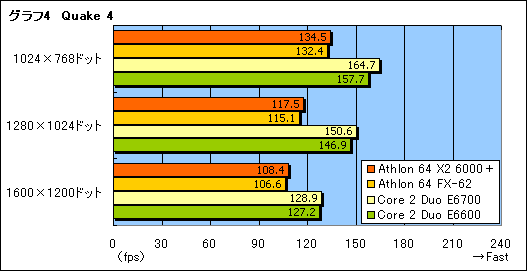 実際のゲームではどうか。FPSから見ていくと,「Quake 4」(Version 1.2)では,3DMark05の結果をさらに極端にしたような結果となった(グラフ4)。1024×768ドットでCore 2 Duo E6600に30fpsも差をつけられ,1600×1200ドットでも20fps弱。完敗だ。