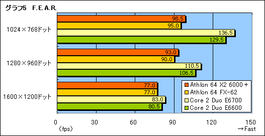 グラフ5に用意したFPS「F.E.A.R.」(Version 1.08)のスコアもQuake 4に近い結果だ。ここでも1024×768ドット設定時にAthlon 64 X2 6000+とCore 2 Duo E6600の間には30fpsもの差がついており,勝負になっていない印象である。
