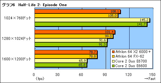 FPSの3タイトルめは「Half-Life 2:Episode One」だが,結果は興味深いものとなった(グラフ6)。1024×768ドット設定時にはCore 2 Duo E6600(や同E6700)から大きな差をつけられているAthlon 64 X2 6000+が,1280×1024ドット以上では逆転するのである。