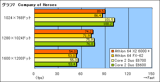 いずれにせよ,Athlon 64 X2 6000+のパフォーマンスは,1280×1024ドットまでの解像度でCompany of Heroesをプレイするに当たってとくに問題のないレベルといえる。