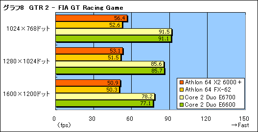 グラフ8はレースシム「GTR 2 - FIA GT Racing Game」のテスト結果である。このグラフの形はQuad FX評価システム(≒Athlon 64 FX-74×2)のレビュー時とほぼ同じだが,負荷の低いゲームタイトルだと,地力の差が顕著に出てしまう。