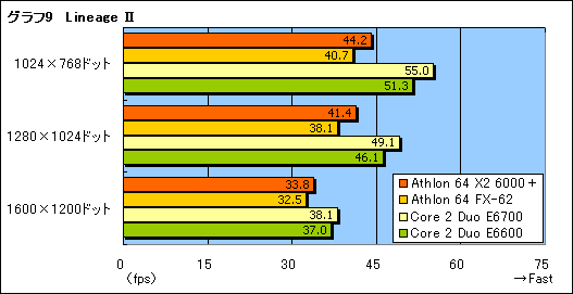 グラフ9はMMORPG「Linage II」のテスト結果をまとめたものである。Linage IIの場合,フレームレートが30fpsを超えていれば,CPUのパフォーマンスとしては合格。そのため,問題ないスコアといえばそれまでだが,Core 2 Duo E6600との間にかなりの差があるのも事実だ。