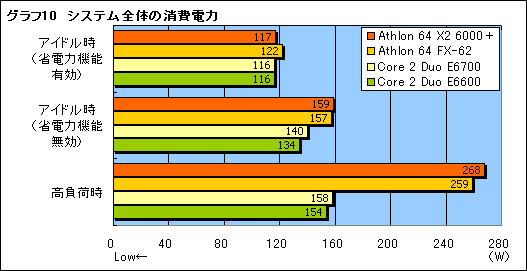 というわけでグラフを見てみると,省電力機能有効時はCore 2 Duoと互角の消費電力となったAthlon 64 X2 6000+だが,無効化するとCore 2 Duo E6700よりも20W近く高くなってしまった。さらに,高負荷時は268Wで,Core 2 Duo E6700との差は100W以上だ。