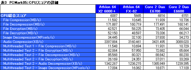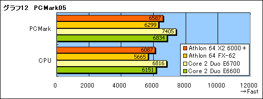 最後に,ゲーム以外の一般的なシステム性能をざっと見るため,「PCMark05 Build 1.2.0」を実行した。総合スコアはグラフ12に,CPUスコアの詳細は別途表3にそれぞれ示したので,興味のある人はチェックしてみてほしい。グラフの傾向はQuake 4とよく似ている。