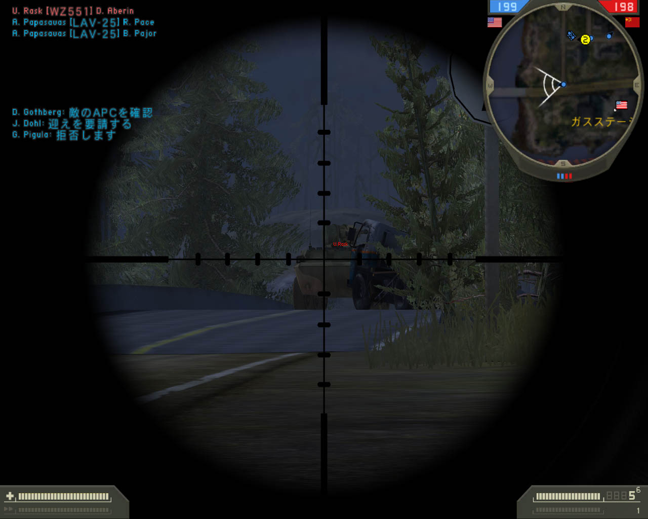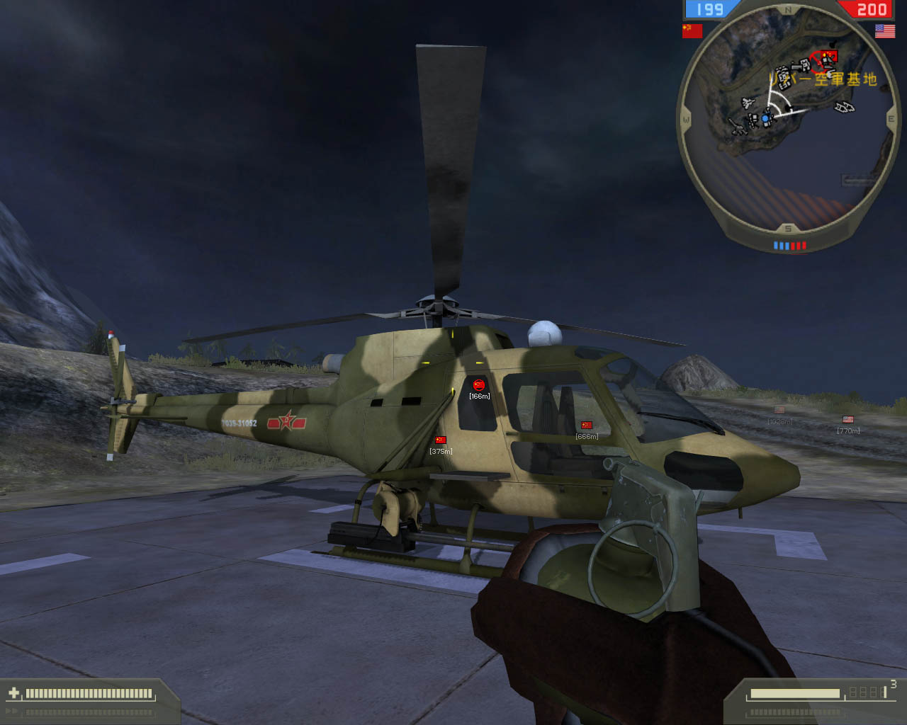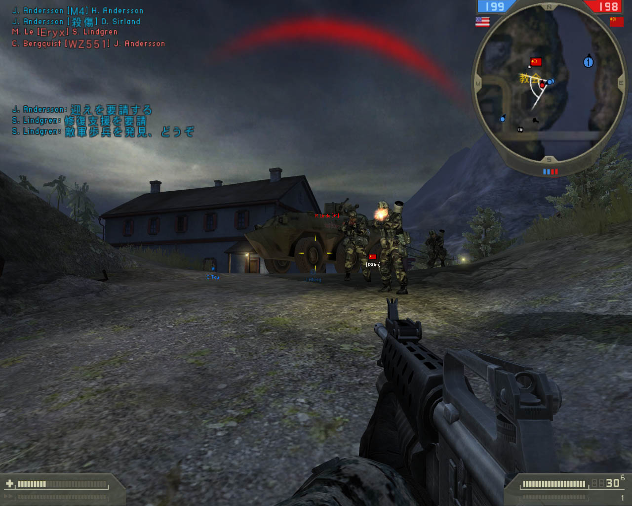 偵察ヘリコプターは,前進につれて周囲の敵を味方に自動的に知らせるというUAV(無人偵察機)のような機能を持っている。ただし,搭乗できるのはパイロットを含め3名で,小隊システムとの兼ね合いが悩ましい。小隊長が偵察機に乗り,敵を見つけ次第隊員が降下,敵の殲滅を図る。で,やられたら機上にリスポーン,という図式も美しいような気がするが,人数的にそれはできないのだ。3名からなる偵察小隊を編成し,コマンダーの命令によって危険区域上空を飛行する,という使い方がいいだろう。そうなれば,UAVが複数あるようなもので,隊員の得られる情報も飛躍的に向上するはずだ。