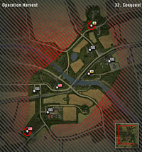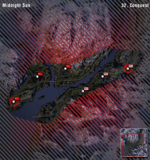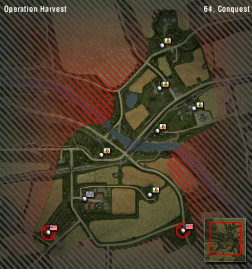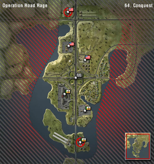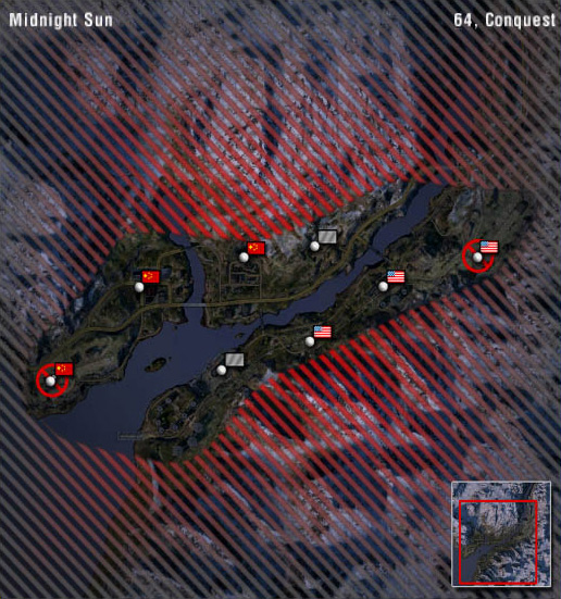 どちらもConquestだが,32人用ではどちらの拠点も同数あり,メインとなる拠点は占領不可能。対して64人用では,アメリカ側が二つの占領不可能の拠点を持つだけで,残りの拠点の大部分はMECがすでに占領しているものの,占領不可能な拠点は持っていない。戦域も川の周辺でぐっと細くなっており,そのため,橋および渡河可能な浅瀬をめぐる戦いが不可避的に発生するのである。