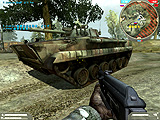 | ロケット発射施設,潜水艦基地,大型空母などバラエティ豊富なマップが,マルチプレイ用に8種類追加された | 新たに追加された,BMP3戦闘兵車。戦車が登場しないので,上手に運用すれば敵兵にとって重大な脅威となるはず | ところがBMP3の後部席から外はまったく見えず,こんな感じ。「最近どう?」とか,隣席の彼に話しかけてみたくなる |