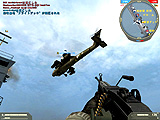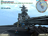 | 新登場のロシア製ハインド攻撃ヘリコプターで空母強襲。艦載の強力な対空火網と敵ヘリコプターには要注意 | 艦橋のファランクス近接兵器システムで防空任務中,迫ってきた敵歩兵を思わず攻撃。こりゃあ人に向けたら危ない | これも新兵器。ただのピックアップトラックに機関銃を載せたものなので,防御力は皆無。ガラスなんて割れてるし |