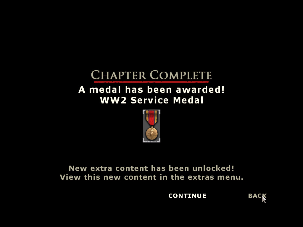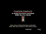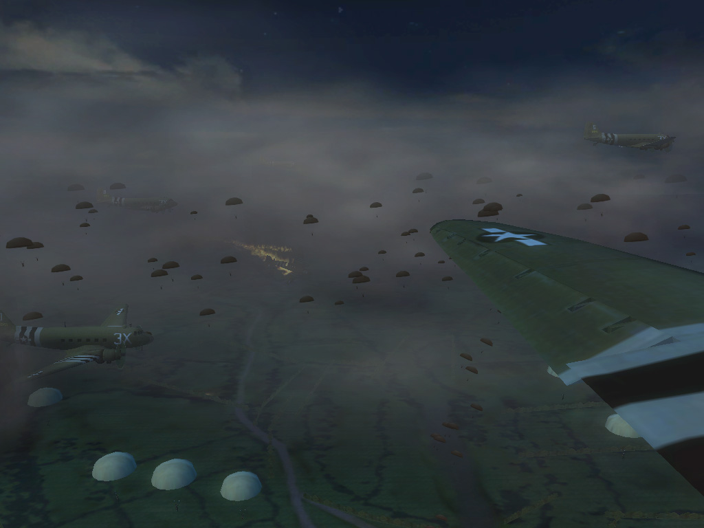 | 輸送機を対空砲弾が直撃! まだ準備は万全ではないが,墜落する前に脱出しなければならない | 対空砲の容赦ない攻撃に次々と撃墜される連合軍の輸送機。空挺部隊もバラバラに散ってしまう | チャプターが終了するとメダルが授与され,資料などの隠しコンテンツのロックが解除される |