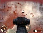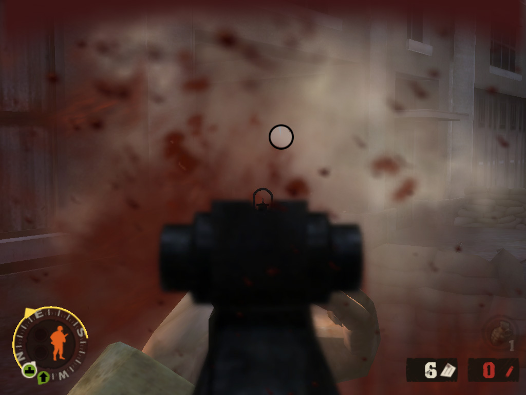 | 状況把握モードでは俯瞰視点で敵と見方の位置取りが確認できる。このモード中は時間が流れない | 崩れかけた民家の2階にも敵が。これぞ市街戦の醍醐味だが,少々厄介な敵であることに間違いはない | これぐらいの近接戦でもアイアンサイトを覗かずに命中させるのは至難の業。噴き出す血しぶきが…… |