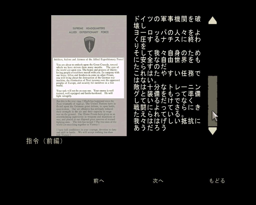 また,ミッションを一つクリアするごとに1部ずつ閲覧可能になっていく,アメリカ国立公文書館の当時の資料やゲーム開発の裏側など,"ボーナス"のドキュメントも,すべて日本語でじっくり読める。このドキュメントの数々,「こんなの軍事マニア以外は喜ばないのでは」などと敬遠してはいけない。長らく国家機密だった作戦指令書や,当時の兵士が書き残した本物の手記など,そこに書かれた情景がそのままゲーム中で再現されていたりする。ゲーム中盤に登場する"コール突撃"の,コール中佐のオフィシャルレポートといったドキュメントもあるのだ。これらはゲーム内容と密接に関連しているといってもいいだろう。