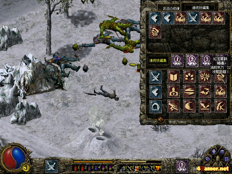 | 1系統の武術を3種類すべて習得することで,その系統の奥義が使用可能になる。Altキーを押しながら「/」や「>」といった記号を描いたあと,対象を右クリックすることで,奥義が発動。ブラウザなどではよく用いるマウスジェスチャーによる操作を,まさかアクションRPGですることになるとは思わなかった |