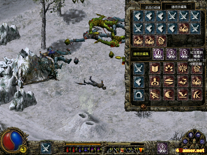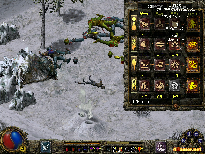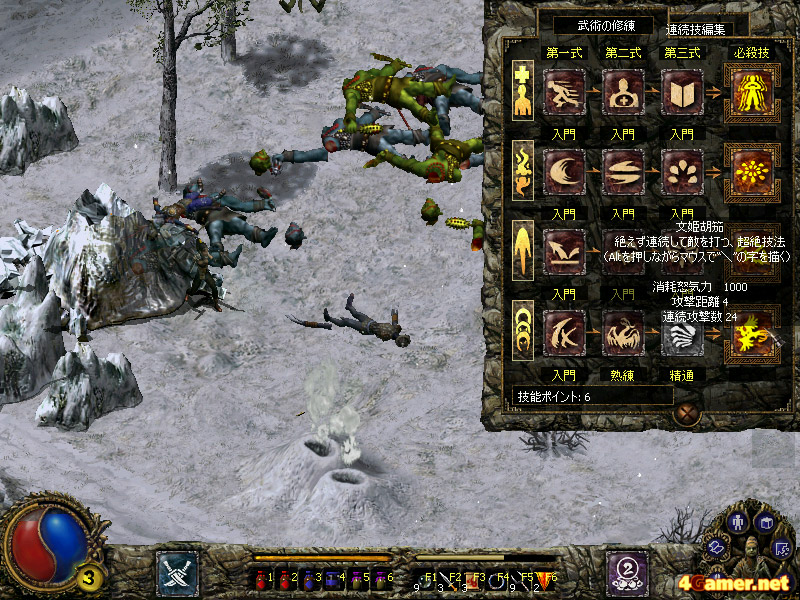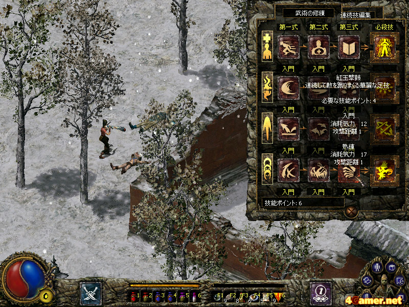 | レベルアップ時に得られる技能ポイントを消費し,奥義を習得することができる。奥義はプレイヤーキャラクターごとに4系統・3種類ずつ用意されており,一つの武術を複数回強化することも可能。スキルツリー形式の分岐はないが,どの武術をどれだけ強化するかで,ゲーム展開に多少の差は生じてくる |
