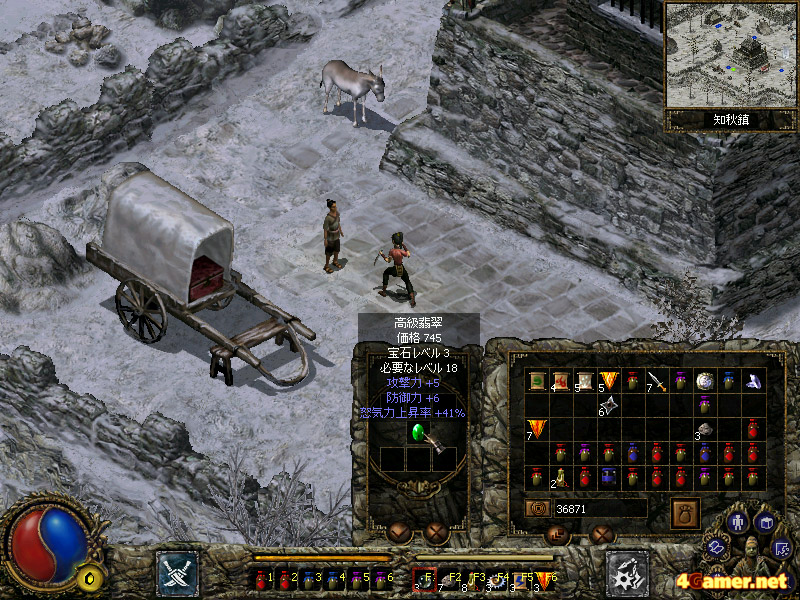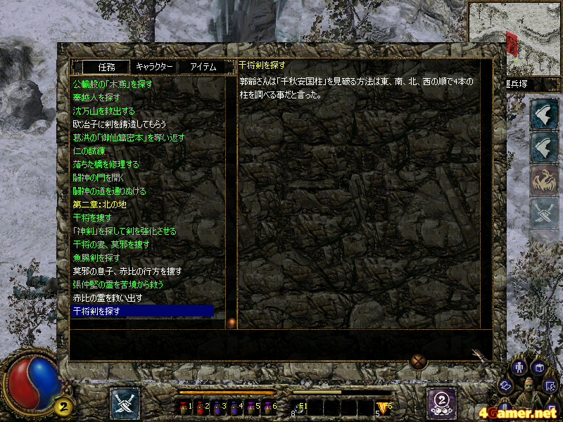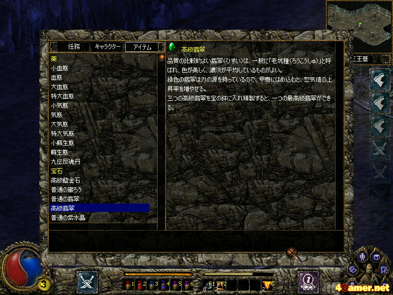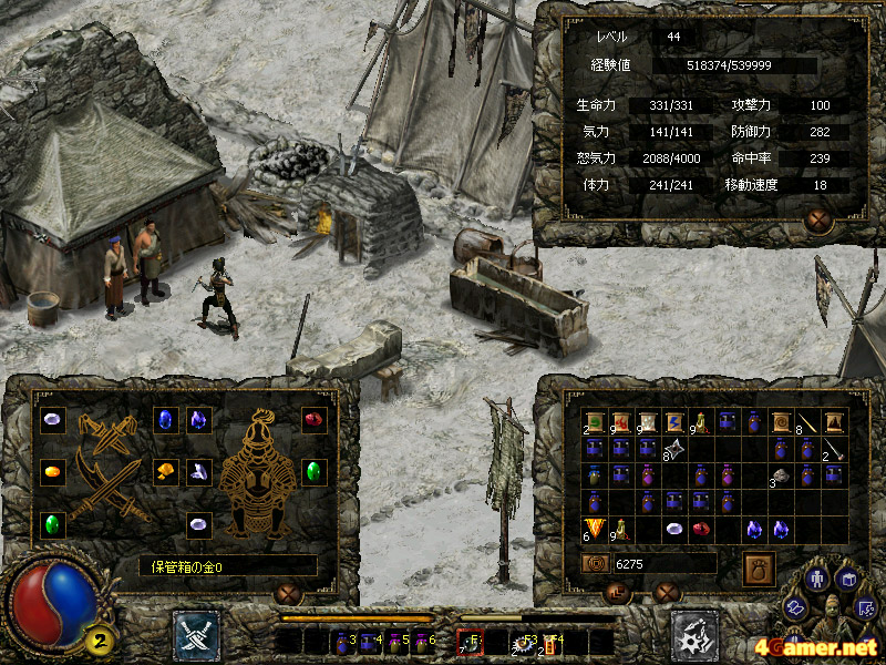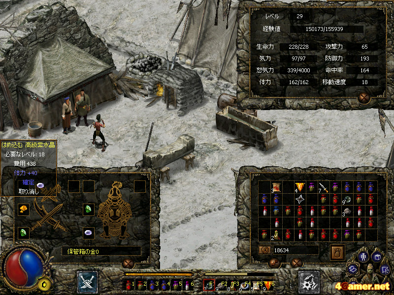 また,武器や防具を装備してキャラを強化する,という概念が存在しないのは,一人のRPGファンとしてはマイナスに思えた。「刀剣」では武具の交換ではなく,武具に特殊な宝石をはめることで戦闘力を強化する。よって購入・入手できるアイテムは,武器や防具以外の消費アイテムがメインとなる。イベントなどで宝剣を入手したり,鎧を強化することはできるのだが,ゲーム内では「宝石を填めるための穴が増える」という処理になる。宝石を合成してより価値のある宝石を作ったり,所持しているだけでパラメータがアップする宝石(「ディアブロ」シリーズでいうCharm)が存在したり,使い魔を召喚する札や様々な特性を備える飛び道具などもあったりと,それなりに楽しめる要素はあるのだが……。武具を集め,装備をコーディネートする楽しみが味わえないのは非常にもったいないと思ってしまった。