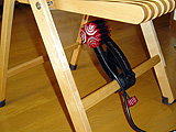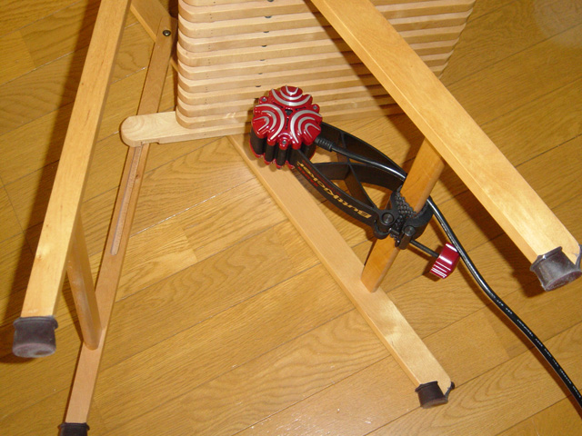 このとき,固定具が金具なので,椅子側の支柱や脚が変形したり,傷がついたりする可能性が高い。固定具が接触する部分には,何らかの欠損対策をしておいたほうがいいだろう。筆者はホームセンターなどで手に入る滑り止め防止材を巻いておいた。