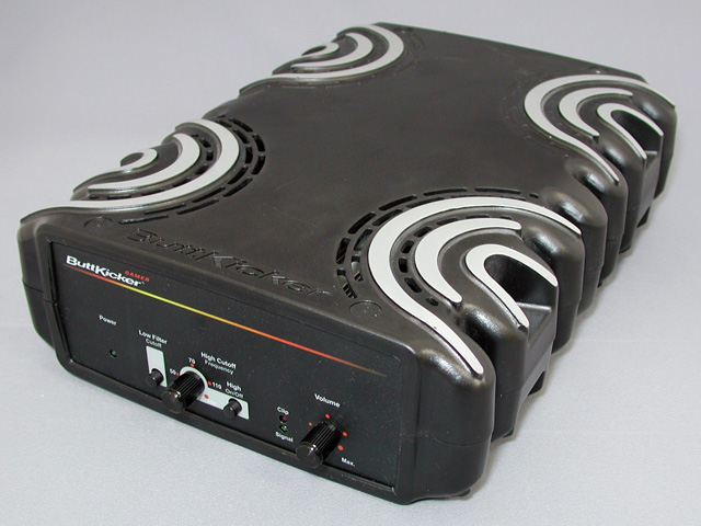 もう少し細かく見てみよう。ButtKicker Gamerは,振動を発生させるユニット(以下振動ユニット)と,低域専用アンプの2コンポーネント構成になっている。