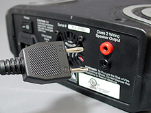 | 振動ユニットと低域専用アンプをつなぐ4mのケーブルは先端が特殊な2ピン仕様になっており,これを低域専用アンプに接続することになる(左)。ケーブル自体は振動ユニットから約1mのところで着脱可能だ(右) | |