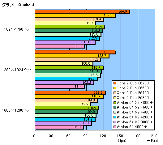 さっそく,実際のゲームを用いたベンチマークテスト結果を見てみよう。まずグラフ1は,「Quake 4」(Version 1.2)における平均フレームレートである。