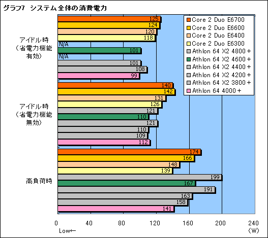 グラフ7において,Core 2 DuoシリーズとAthlon 64 X2シリーズ間で消費電力を比較することに意味はほとんどなくなってしまう。