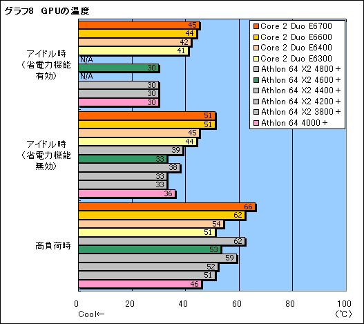 なお,グラフ8はアイドル時と高負荷時のそれぞれにおけるCPU温度を,マザーボード付属のモニタリングツール「PC Probe II」で測定したもの。Core 2 Duo,Athlon 64 X2ともに,リテールパッケージに付属のクーラーを用いているので,ここでも両者の比較に意味はあまりないが,CPUシリーズごとに見れば,いずれもグラフ7を反映したスコアになっているのが分かる。