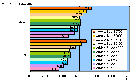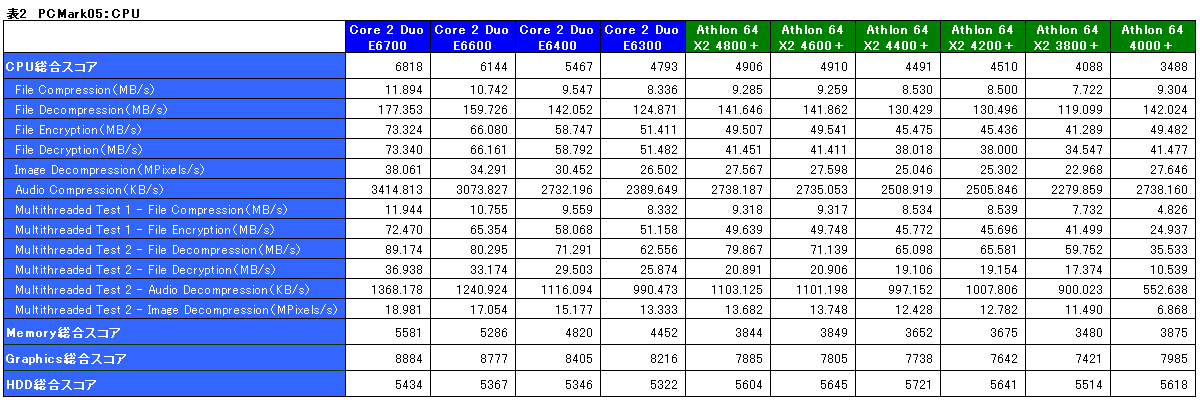 最後に,せっかくCPUを揃えたので,参考までにゲーム以外の性能もチェックしてみよう。グラフ9は,PCアプリケーションの総合ベンチマークテストである「PCMark05 Build 1.1.0」の結果だ。グラフの傾向としては,Quake 4とLineage IIの中間,といったところだろうか。なお,テストの詳細結果については別途表2にまとめておいたので,興味のある人はリンク先をチェックしてみてほしい。