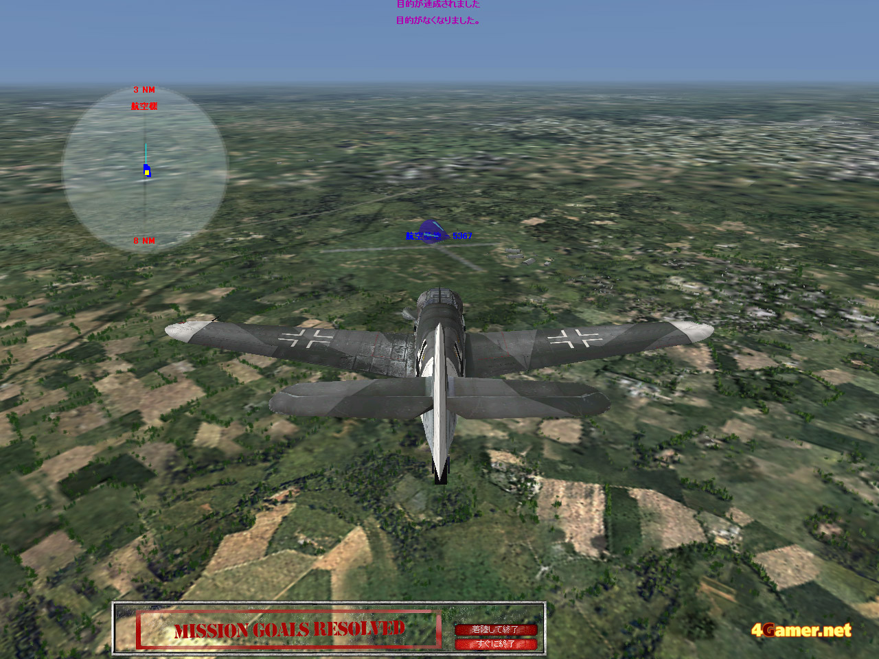 | 左上のレーダーに表示されている水色の線が飛行経路である | 敵機がいなければXキーで超高速移動ができる。これは便利だ | 着陸を省略することも可能だ。初心者には嬉しい機能 | オプションでさまざまな設定が行なえる。自分にあった難度を見つけだそう |
